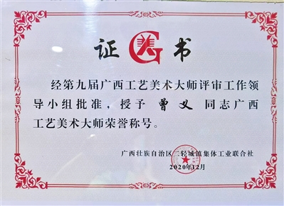 一分耕耘一分收获。近十年来,曾义的作品屡获大奖。他的作品《陶坭雕——飞天罗汉雕版》在第52届全国工艺品交易会上获得“金凤凰”创新产品设计大奖赛银奖;2020年,他的作品《一杆风月》《虽远必诛》获广西“八桂天工奖”银奖,他创作的金属工艺品《战疫情·保家园》在第55届全国工艺品交易会上获“金凤凰”创新产品设计大奖赛铜奖;2021年,他创作的金属工艺品《高原铁骑》在第56届全国工艺品交易会上获“金凤凰”创新产品设计大奖赛铜奖;2024年,他的作品《大山回响·乡情》入选“笔墨丹青 美丽中国”美术作品展作品集;2019年—2024年,他创作的金属工艺品连续6年入选广西壮族自治区艺术作品展。