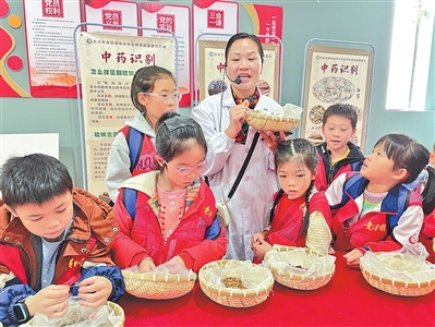 急救技能培训结束后,小记者们走进了弥漫着浓郁药香的中药房。“这是枸杞,可以明目;这是黄芪,可以补气……”医生拿起一味味中药材,逐一介绍名称和功效。小记者们通过看外观、手摸、口尝和鼻闻等方式,对中药材有了更加直观和深刻的认识。