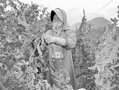 近年来,覃塘区五里镇通过“公司+合作社+基地+农户”的模式引入贵港市涉晰农业科技有限公司发展蔬菜种植,目前位于龙贵村的150亩荷兰豆正值采摘期,预计产量约35万公斤,产值约190万元。图为2月21日村民在采摘荷兰豆。全媒体记者杨小露摄