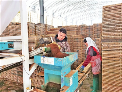 2月25日,记者走进港北区益农农机专业合作社看到,在育秧生产线上,机械化设备将处理好的种子均匀地播撒在育秧盆上。随后,工人将育秧盆送进温室进行培育,24小时后可以培育出2厘米左右的小秧苗,秧苗存活率可达97%。
