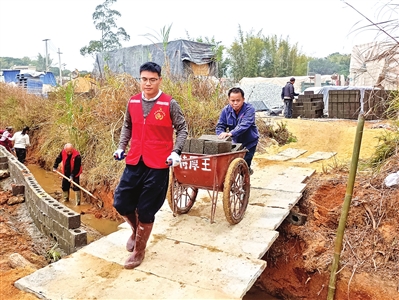 桂平市罗秀镇木村村组织50多名党员干部和群众合力拓路基、清河道,维修路段总长8000米,涉及200余户群众生产出行,有效盘活闲置水田100余亩、林地500余亩。图为近日干群合力修建机耕路。
