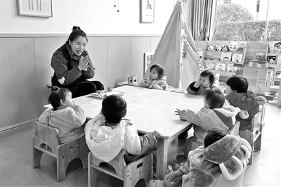 2月24日,贵港市交通警察支队普惠托育园开园。该园共规划托位35个,可为0—3岁婴幼儿提供生活照料、早期教育、平衡膳食等全方位保教服务和科学育儿指导。图为开园当天,保育员在与幼儿互动。