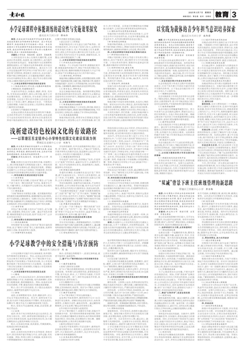 小学足球教学的安全是学生健康成长的保障。在“2+1”教学模式下,通过教学准备、实施、应急处理等多环节的安全措施与伤害预防策略,可有效降低风险。学校、教师和家长应共同努力,确保小学足球教学安全、有序开展,让学生在安全环境中享受足球乐趣,促进全面发展。