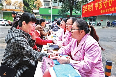 3月8日上午,市中西医结合骨科医院联合港北区西江街道小江社区卫生服务中心开展“芳华有约 中医守护”三八国际妇女节健康关爱义诊活动,免费为社区居民特别是女性居民提供中医健康咨询、养生讲座、养生茶饮以及针灸、拔罐、刮痧等服务。图为活动现场。