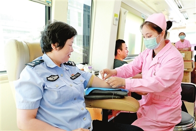 5月21日,平南县公安局组织民辅警参加“热血真情 医警同心”无偿献血主题党建共建活动。据统计,活动中共有27名民辅警献血,累计献血量达9500毫升,用行动践行“人民公安为人民”的初心。图为献血现场。何伟艺摄