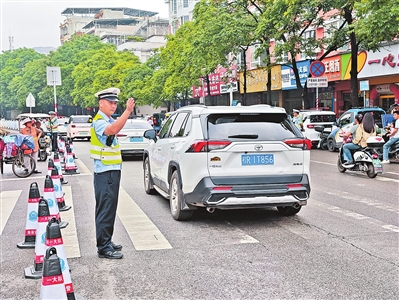 5月31日端午节,市区东湖公园、港南区瓦塘镇香江村分别举办龙舟赛活动。市交警支队协同多部门作战,全方位开展交通安保工作,共投入值班备勤警力880多人,仅在东湖公园周边便布置23个执勤点位、10个机动巡逻组、2个事故应急快赔组,并安排一队路面应急警力随时待命,护航节日道路交通平安。图为值班民警在执勤。