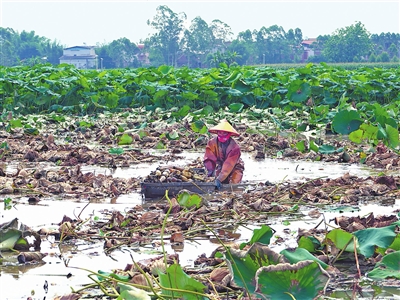 夏日炎炎,藕塘飘香。近日,覃塘区大岭乡古平村莲藕种植基地迎来丰收季,藕农抢抓农时采挖莲藕,经过冲洗、分拣、称重、装车后运往市场。该基地种植双季藕2000亩,早藕上市时间为5月至7月,目前每天出货5000多公斤,不仅在贵港、玉林、南宁等区内市场销售,还远销广东、重庆、上海等地。图为6月4日,该基地藕农正在采藕。