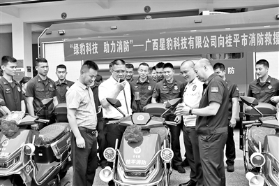 5月28日,广西星豹科技有限公司向桂平市消防救援大队捐赠4辆消防两轮电动车,充当桂平市应急救援装备。两轮电动车小巧灵活,契合了队伍“灭早 灭小 灭初期”的救援需求,将有效提升狭窄街道或大型消防车无法迅速到达区域的应急响应速度。全媒体记者欧钰宇 通讯员杨文福摄影报道