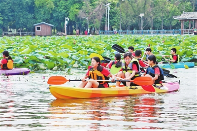 6月4日,港南区第三初级中学约300名学生走出校园,开展以“探索自然乐趣 培养时代新人”为主题的社会实践教育活动,先后前往江南田园生态农场和九凌湖旅游风景区,通过捉虾捕鱼、美食制作、科技探秘、皮划艇体验等一系列实践教育活动,体验自然与科技带来的乐趣。图为学生体验皮划艇运动。全媒体记者黄远会摄