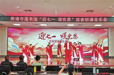 6月29日,市图书馆举行“迎七一 颂党恩”读者朗诵音乐会。活动面向广大市民读者,节目种类丰富多彩,包含朗诵、歌曲、舞蹈、古筝表演等。表演者以饱满的热情和精彩的演出,为观众带来了一场视听盛宴。图为活动现场。