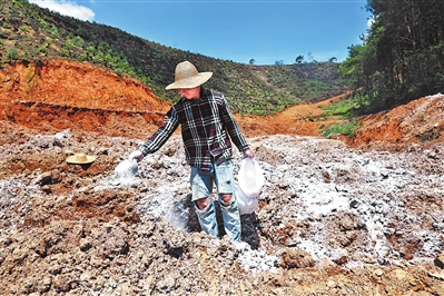 6月25日上午,在同和镇黄豆津屯一山坳处,记者看到,曾经散发着阵阵臭味的两个粪污池一改往昔的黑臭模样,池底土地变得平整,工作人员正在撒放石灰粉,白色石灰粉覆盖在土壤表面,仿佛披上了一层“白纱”,高温暴晒下,石灰消毒作用得到充分发挥。