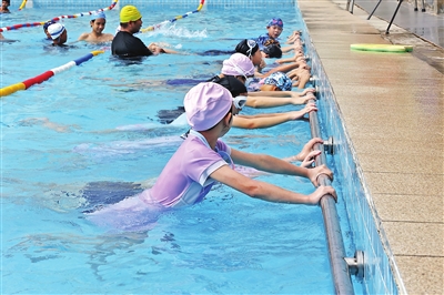 泳池另一边,10岁的梁炜杰正在教练指导下练习仰泳。“我已经练习游泳两年了,我很喜欢游泳,教练还教我们游泳‘六不准’和防溺水知识。”梁炜杰说。