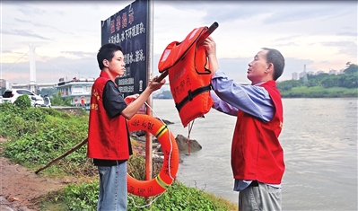 “以前暑假每天要巡1.5公里河岸,嗓子都喊哑了。”大湾社区防溺水队队长覃颖健翻出手机里的老照片:“这是2021年8月,队员劝离在江边玩水的孩子……”