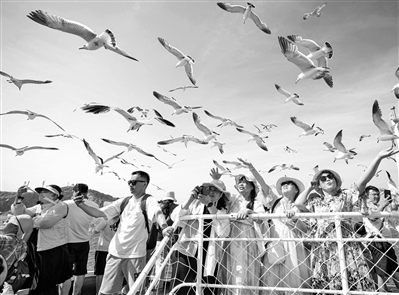 7月5日,在山东省荣成市海驴岛海域的一艘游船上,游客与黑尾鸥互动。随着暑假的到来,各地迎来暑期旅游旺季。新华社发(李信君 摄)
