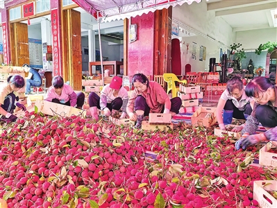 桂平市中沙镇今年荔枝种植面积达1.3万亩,预计产量7600吨。该镇通过精准对接长三角大型商超及水果经销商,同步优化供应链条,在镇区集散点实施“采摘—预冷—装箱—发运”12小时极速流程,并协调冷链专车直运,确保鲜果48小时内抵达上海等消费市场。目前,全镇单日外销优质荔枝2.5万公斤。图为7月2日,果农在分拣荔枝。全媒体记者杨小露 通讯员陈隆宇摄影报道