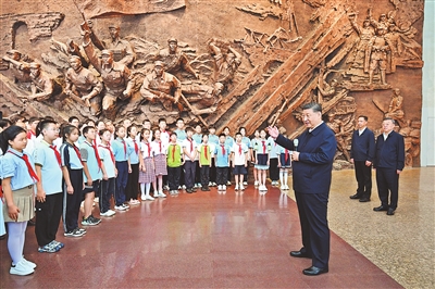 在纪念馆大厅,习近平同前来参观的青少年学生和纪念馆工作人员亲切交流。他说,88年前的今天发生的“七七事变”,是中华民族全面抗击日本侵略者的起点,前事不忘、后事之师,到这里来就是接受精神洗礼。广大青少年生逢其时,要赓续红色血脉,树立强国有我的远大志向,做堂堂正正、光荣自豪的中国人,勇担民族复兴的时代大任。
