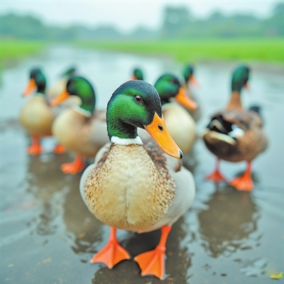 赶鸭需用细长竹竿,竿顶系红、蓝或黑的布条。我与父亲一前一后充当“鸭司令”,挥舞竹竿控制方向。鸭子走陆路过公路时,六百只排开一里地。父亲在前引路,说鸭子是群居动物,只要领头鸭方向对,后边自然跟上;我在后负责看管离队者。偶有鸭子走偏,会带偏一大片,甚至走上公路中央。过往司机也不急,停车等待,形成短暂的无形红绿灯。鸭群全部过路后,父亲向司机们点头致意。若走水路,我们便分走江两岸。窄窄的江段,长竹竿有时能伸到对岸。我走在左岸干枯的玉米秆叶上,雨鞋沙沙响,流水潺潺,鸭子嘎嘎叫,伴着父亲脖子上播放的壮语山歌,构成我对盛夏暑假难忘的回忆。