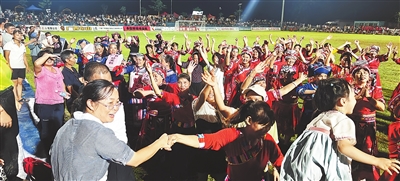 “潮动三月三・民族体育炫”乒乓球赛上,140余名各族运动员以球会友,小小的乒乓球,在球桌上来回穿梭,传递着团结与友谊,选手们在切磋中增进了解,彰显团队精神。民间足球争霸赛、稻香杯足球超级联赛中,各族球员默契配合,奔跑射门;场外观众不分彼此,为精彩瞬间欢呼。