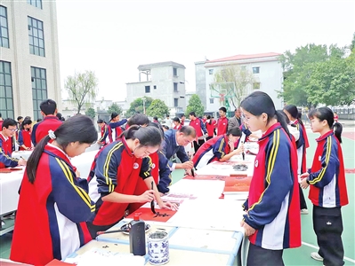 1月16日,覃塘区覃塘街道第三初级中学开展“师生共挥毫,佳联迎新春”写春联送祝福活动,书法社团学生在老师与家长的指导下专注书写。自由创作环节,师生将新春祝福倾注笔端,作品统一展示,大家在欣赏中交流心得,现场洋溢着浓浓的年味。图为活动现场。